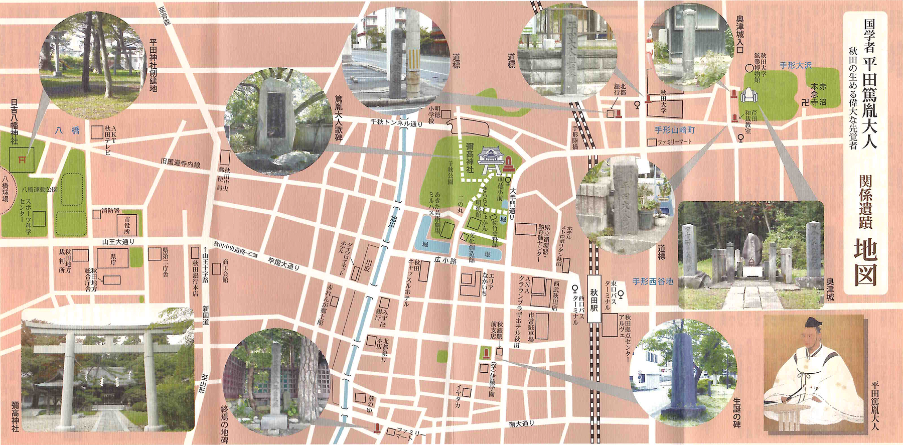 安永5年(1776)8月24日久保田城下、現秋田市中通に佐竹藩士大和田清兵衛祚胤の四男として生まれる。20歳に志を立て、江戸に出て苦学力行を極める。25歳の時、備中松山藩士平田篤穏の養嗣子となる。享和元年(1801)本居宣長翁没後の門人となる。享和3年(1803)28歳には最初の著書「呵妄書」を著わし、以来精勤刻苦和漢洋の書籍を読破し、いよいよ学問に心血をそそぎ、国家の蘊奥をきわめ、遂には皇朝古道学の泰斗をなし、敬神崇祖の心をといた。生涯に著述百部千余巻にして、古史、古道、易学、暦学、仏学、道学、儒学、文学、語学、尺度量法、諸宗門、和漢洋学に亙って万搬の考究をし、「霊能真柱」「古史伝」「古道大意」は神道史上における重要な著書であり、篤胤の思想の中心となるものであった。 その学問と思想は地方神宮、郷土、豪農、商人、武士から庶民にいたるまで受け入れられていった。門人553人、没後の門人1330人余と多く、ついには白川神祇伯家学頭となり、吉田家の依頼をうけて古学教授ともなった。天保12年(1841)66歳の時、幕命により国許退去によって帰藩、天保14年(1843)閏9月11日68歳で没する。